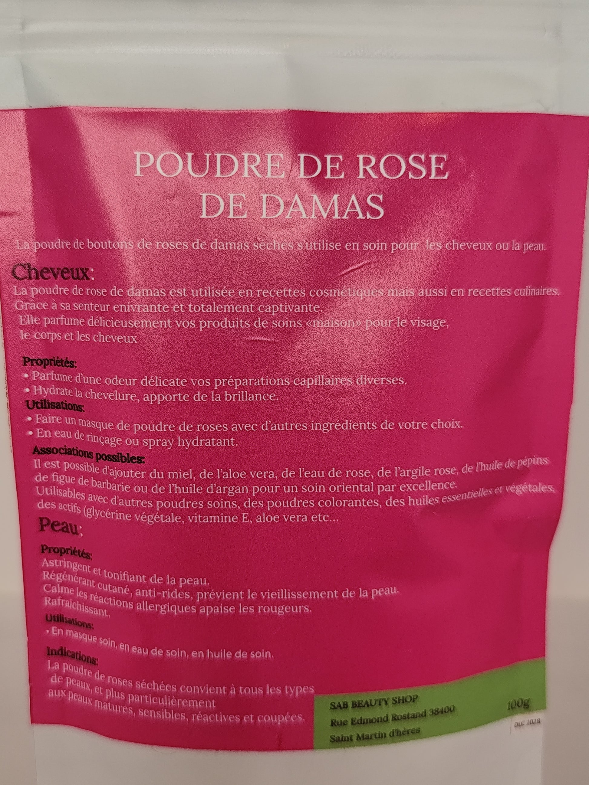 La poudre de rose de Damas séchés s'utilise en soin pour la peau et les cheveux. Ils parfument, hydratent et apportent de la brillance aux cheveux. Aux vertus astringente,antirides et rafraîchissantes, ils conviennent tous types de peaux et en particulier les peaux matures, réactives et coupe rosées.